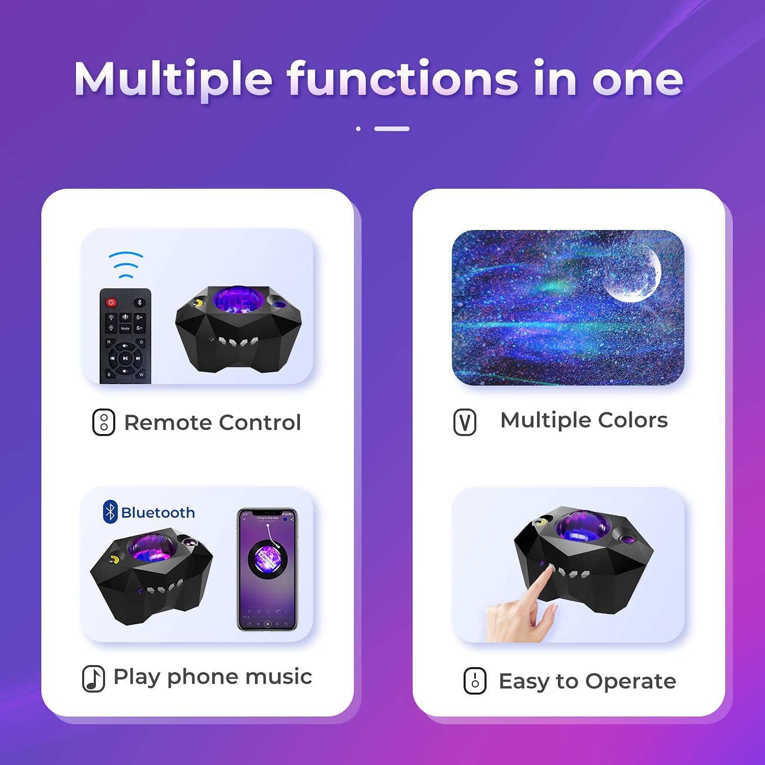 You can adjust your needs by remote control, choose the aurora wave or starry sky, moon projection mode, or choose three modes at the same time, change the color speed and brightness of the light, adjust the volume and sound mode of the music mode.